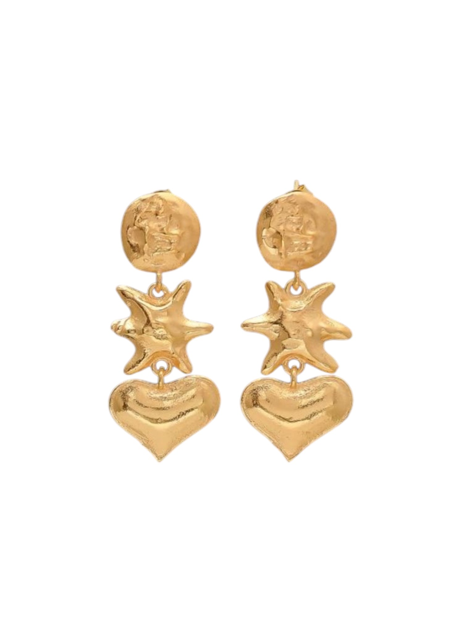 Inspired by the charm of Spanish and Italian coastal towns, these 4.5 cm gold-plated sterling silver earrings combine a full moon, a star, and a heart in one bold design. A playful yet elegant statement piece that captures romance, mystery, and Mediterranean spirit.